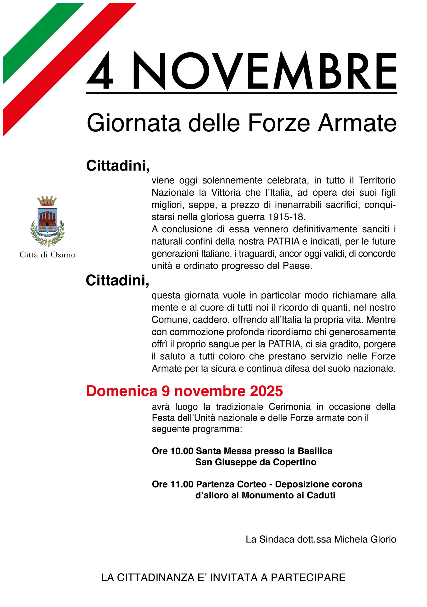 4 NOVEMBRE – Giornata delle Forze Armate – 9 novembre ore 10.00 Articolo pubblicato:23 Ottobre 2025 Categoria dell'articolo:Eventi / EVIDENZA