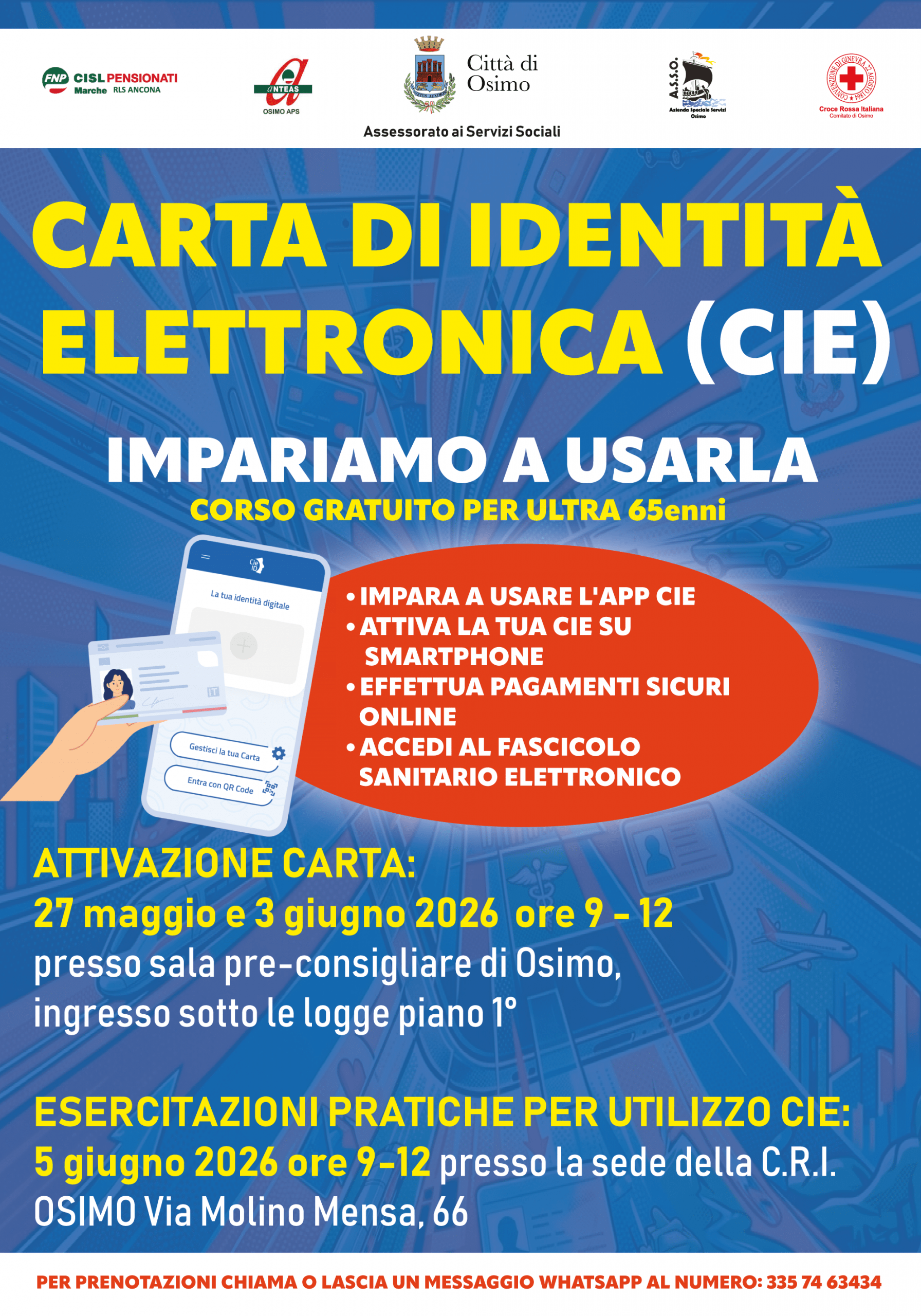 1. ATTIVAZIONE CARTA 27 maggio e 3 giugno 2026 ore 9 – 12 (porta con te la CIE con il codice PIN) presso sala pre-consigliare di Osimo, ingresso sotto le logge piano 1°