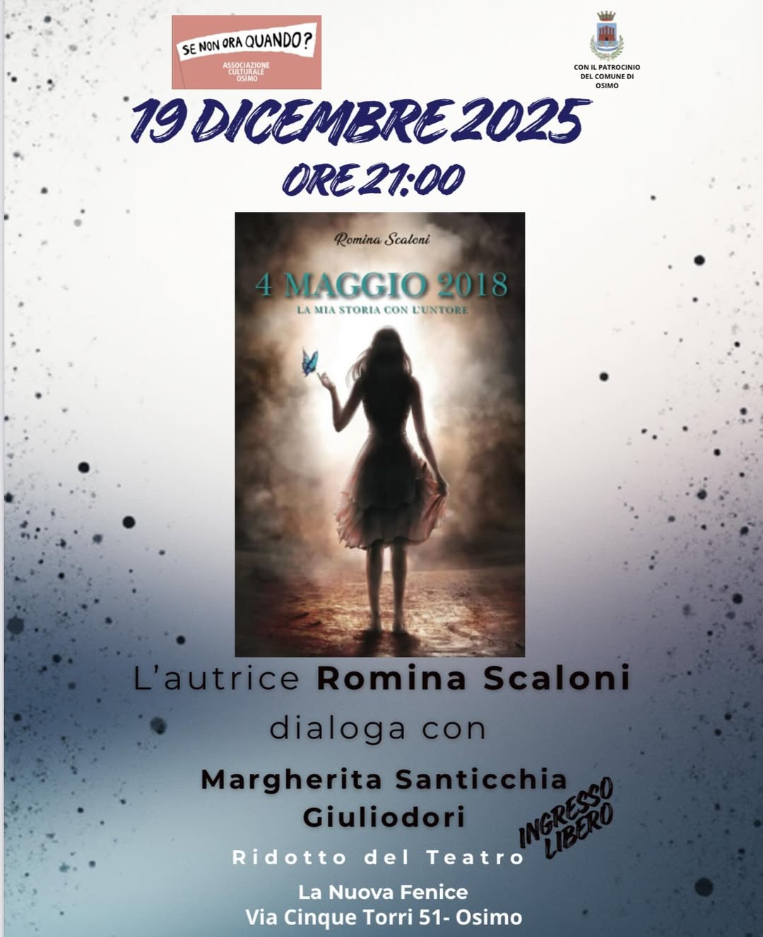 Venerdì 19 dicembre 2025, alle ore 21.00, presso il Ridotto del Teatro La Nuova Fenice di Osimo, si terrà l’incontro con l’autrice Romina Scaloni, in occasione della presentazione del libro “4 maggio 2018. La mia storia con l’untore”.