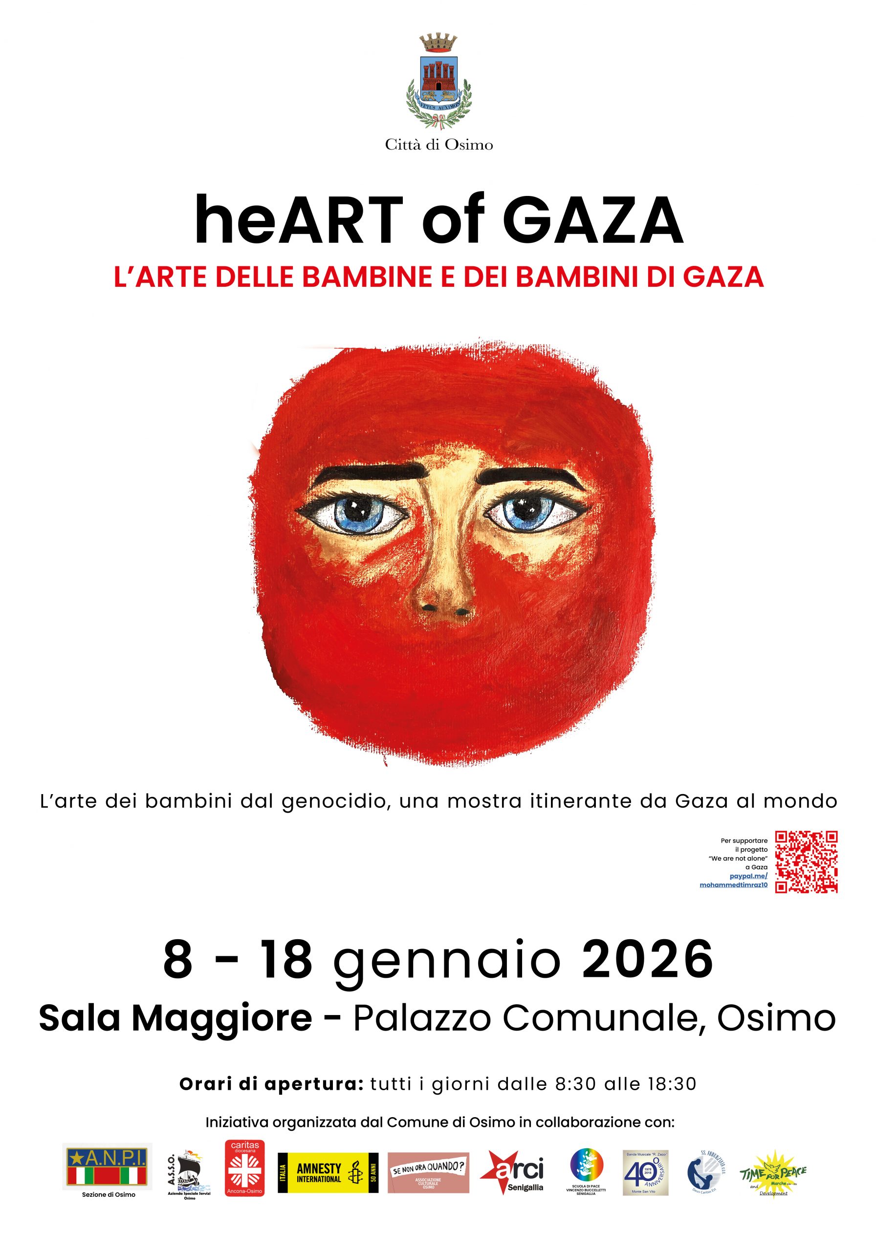 Dall’8 al 18 gennaio 2026, il Comune di Osimo ospiterà nella Sala Maggiore del Palazzo Comunale una mostra di disegni di bambini e bambine che vivono nella zona centrale della Striscia di Gaza, dal titolo “HeART of Gaza”.