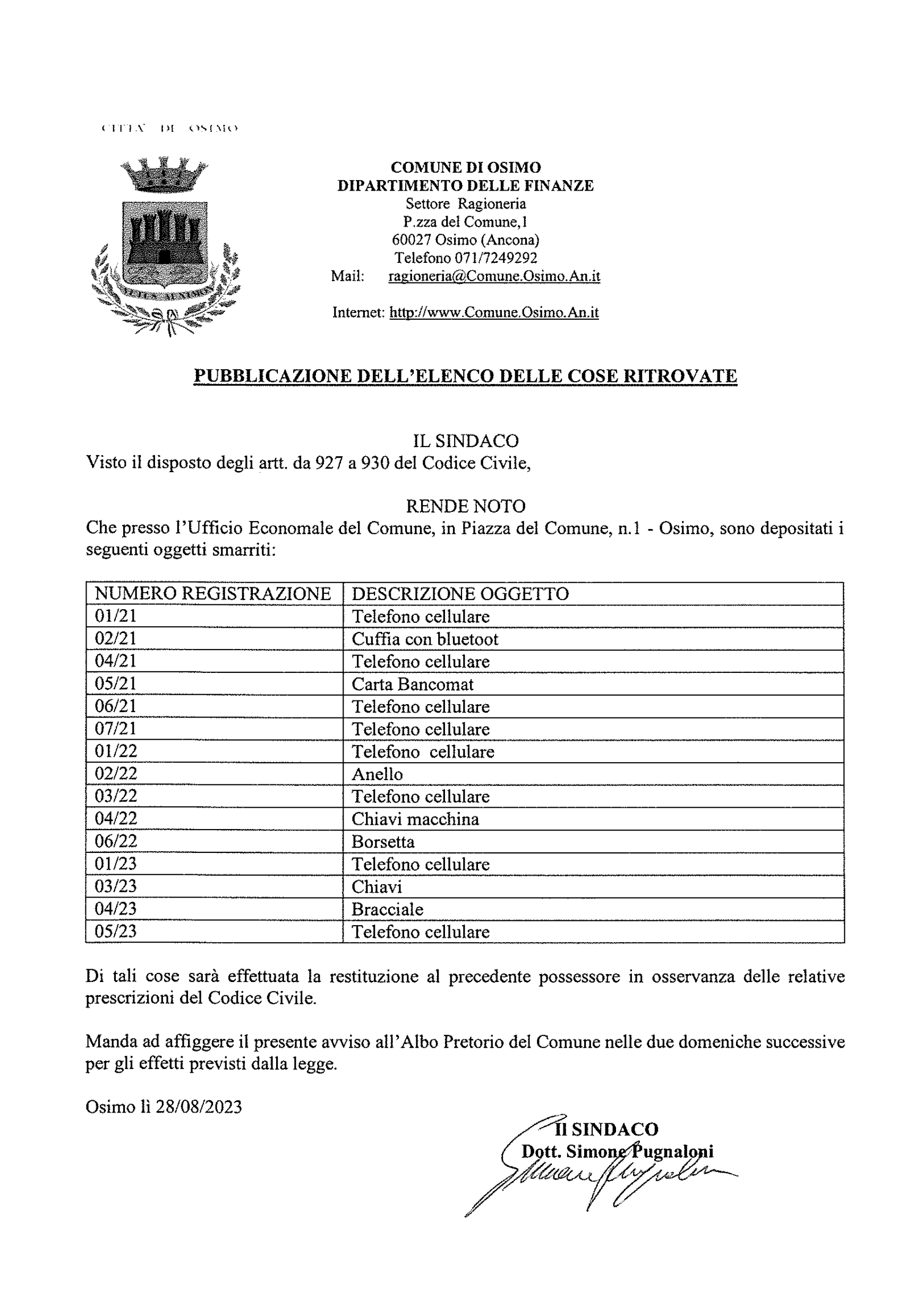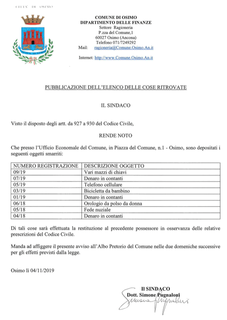 Gli oggetti rinvenuti o trovati per caso dai cittadini o dalle Forze dell’Ordine (Carabinieri, Polizia di Stato, Polizia Municipale) vengono registrati presso l’Ufficio Economato del Comune. L’elenco degli oggetti trovati, di cui non viene rintracciato il proprietario, viene pubblicato all’Albo Pretorio per due domeniche successive.