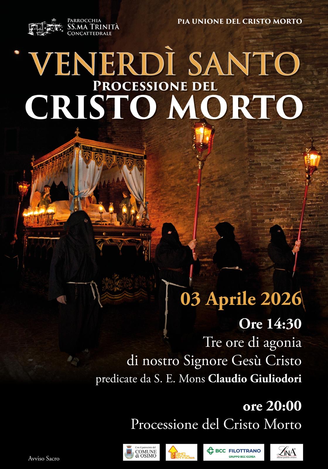 TRADIZIONALE PROCESSIONE DEL VENERDÌ SANTO 3 aprile Articolo pubblicato:2 Aprile 2026 Categoria dell'articolo:Eventi / EVIDENZA VENERDÌ SANTO PROCESSIONE DEL CRISTO MORTOAvviso Sacro03 Aprile 2026 Ore 14:30 Tre ore di agonia di nostro Signore Gesù Cristo predicate da S. E. Mons Claudio Giuliodoriore 20:00 Processione del Cristo Morto